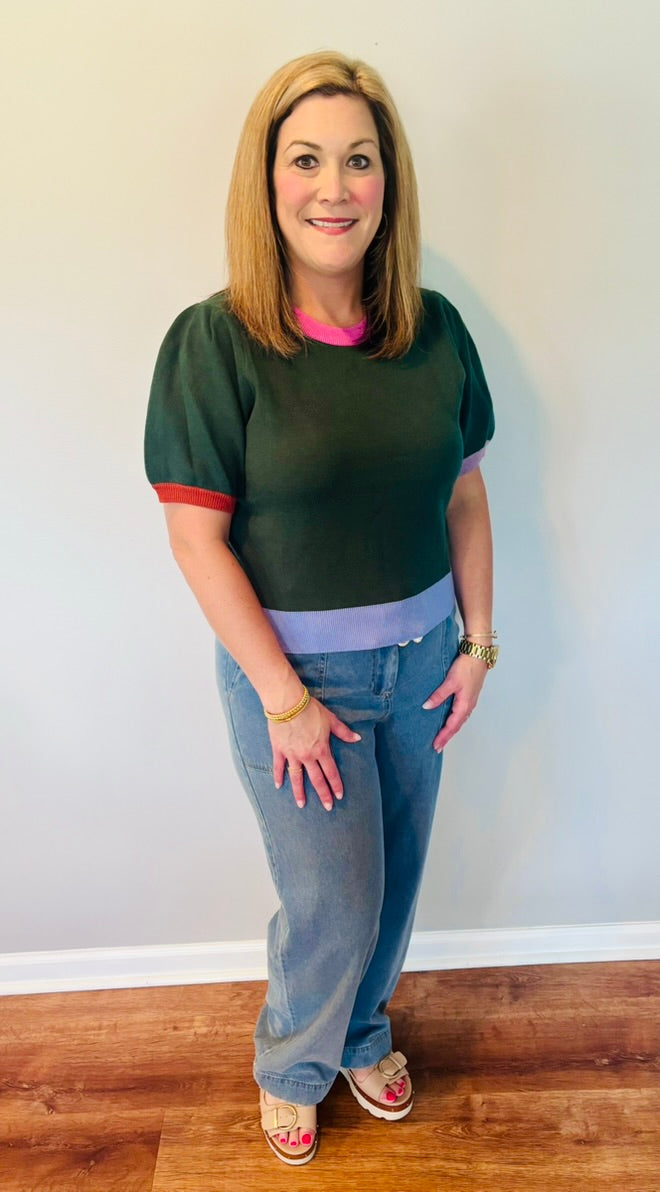 Solid V-neck short puff sleeve sweater knit pullover top featuring colorblock accent rib detail. Unlined. Knit. Non-sheer. Lightweight.