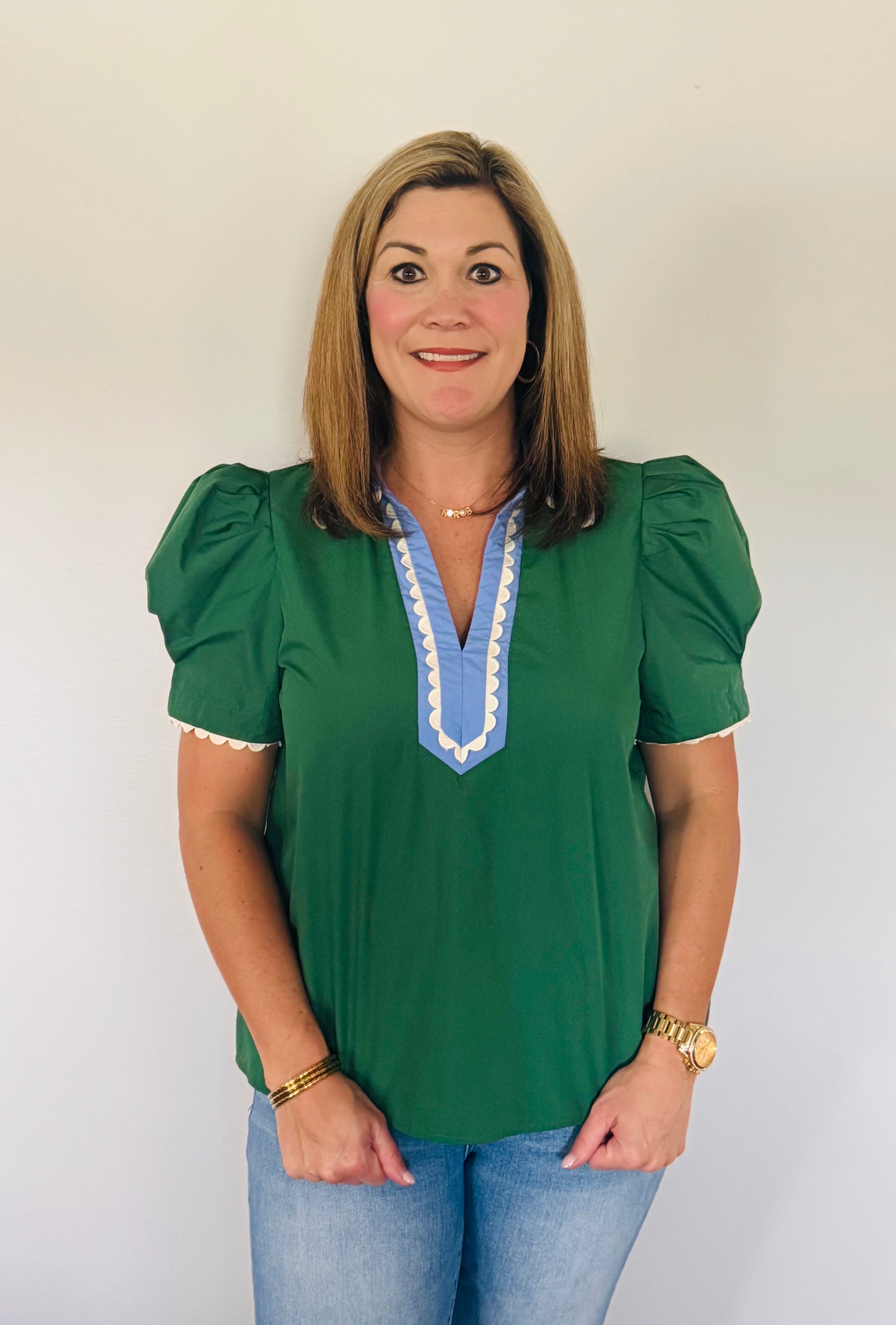Solid pleated puff shoulder sleeve pullovertop featuring scallop edge contrasted caftan-inspired high neck band collar. Unlined. Woven. Non-sheer. Lightweight.