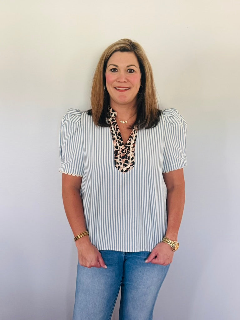 Stripe pattern contrast cuff band puff sleeve featuring cheetah split collar pullover top. Unlined. Woven. Non-sheer. Lightweight.