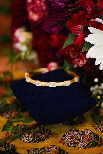 including Black Agate, Pyrite, Mother of Pearl, and CZ. It looks great worn alone or stacked with the so many other pieces from this collection.